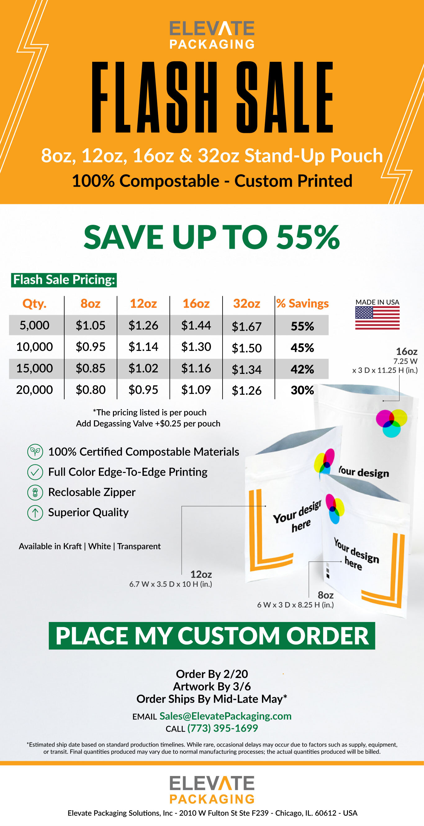Custom Printed 8oz, 12oz, 16oz, and 32oz Compostable Stand-Up Pouches